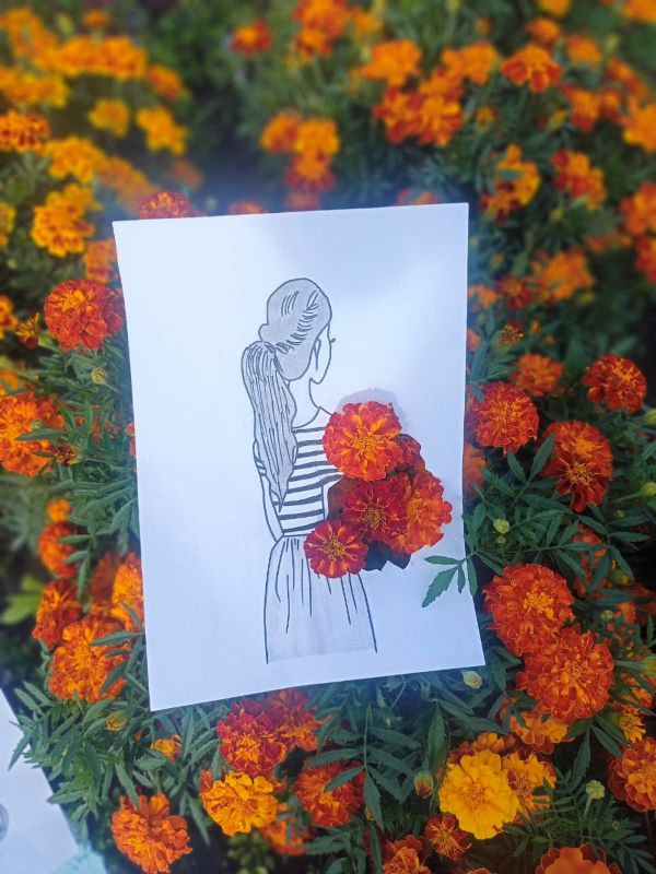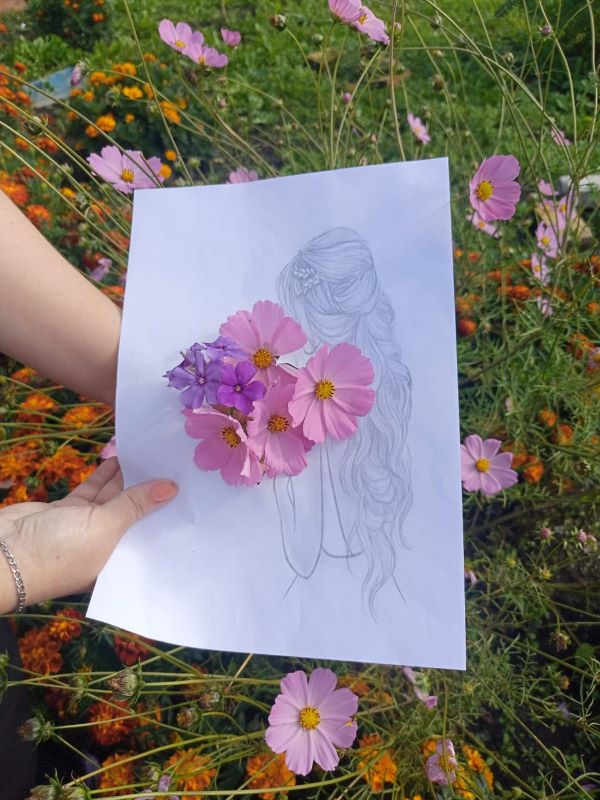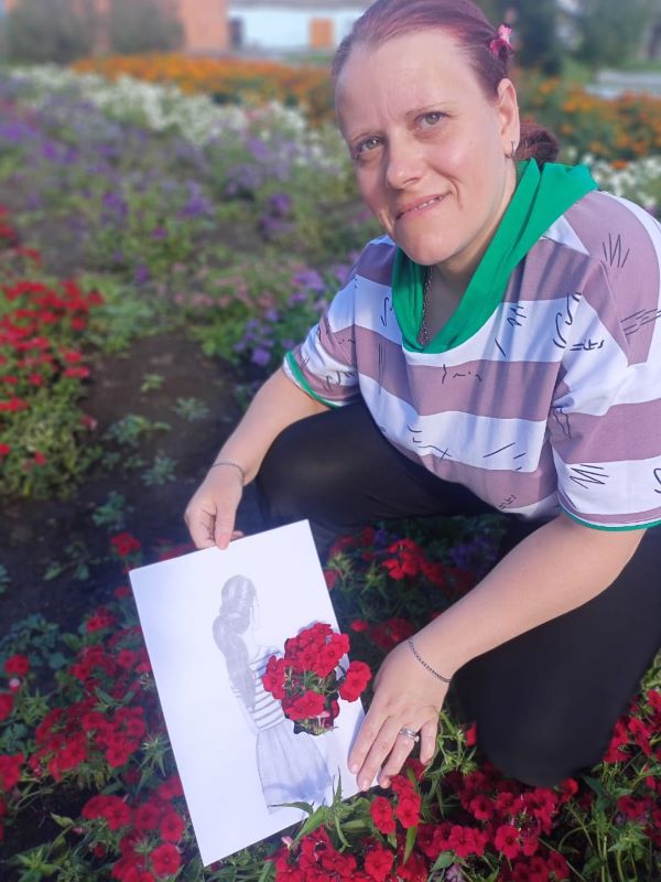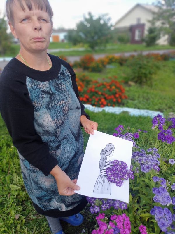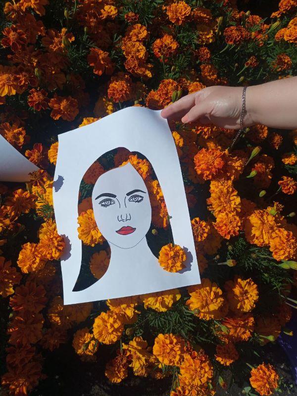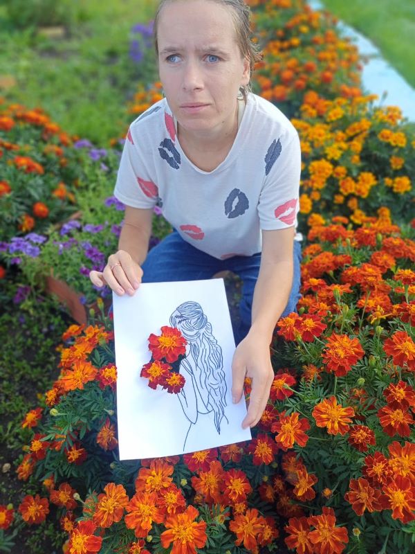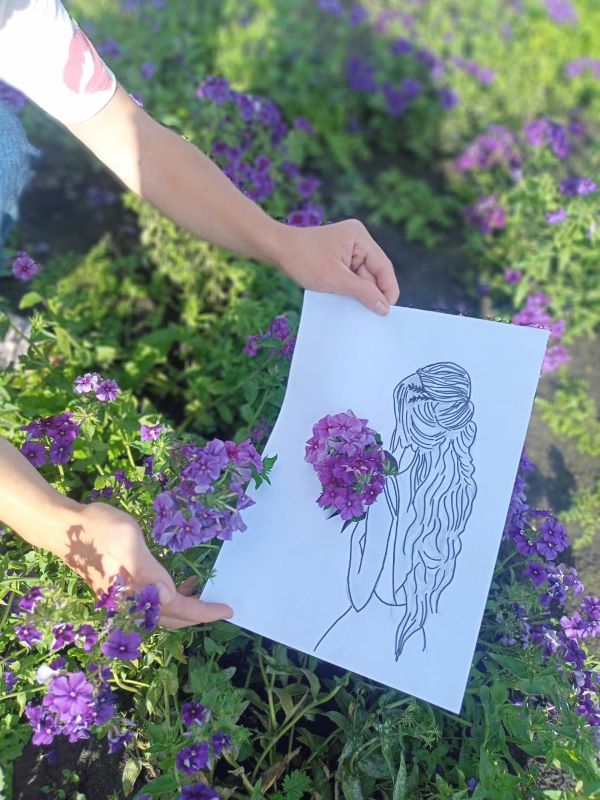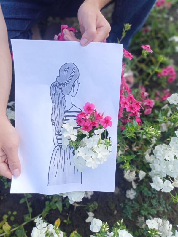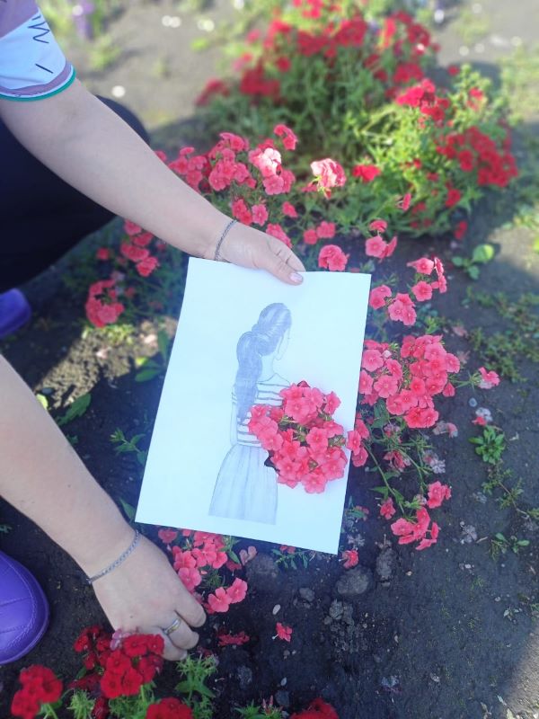 В последний теплый и солнечный день лета мы с получателями социальных услуг вышли на территорию и решили поимпровизировать на наших клумбах с цветами. Эксперимент сочетал бумажную фотографию-трафарет и живую растительность. Цветы становились продолжением изображения, создавая эффект «натуральных причёсок» и «букетов» у персонажей на снимках.