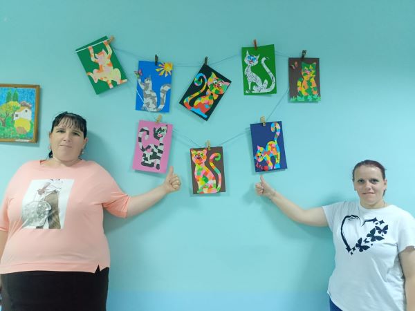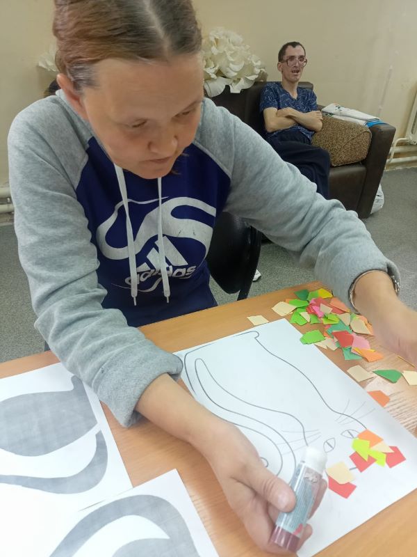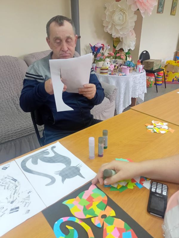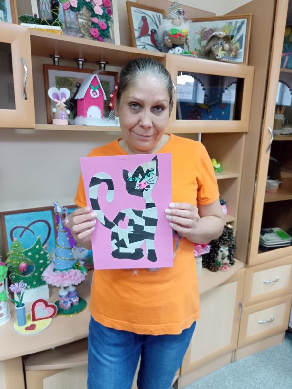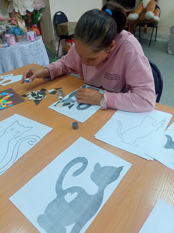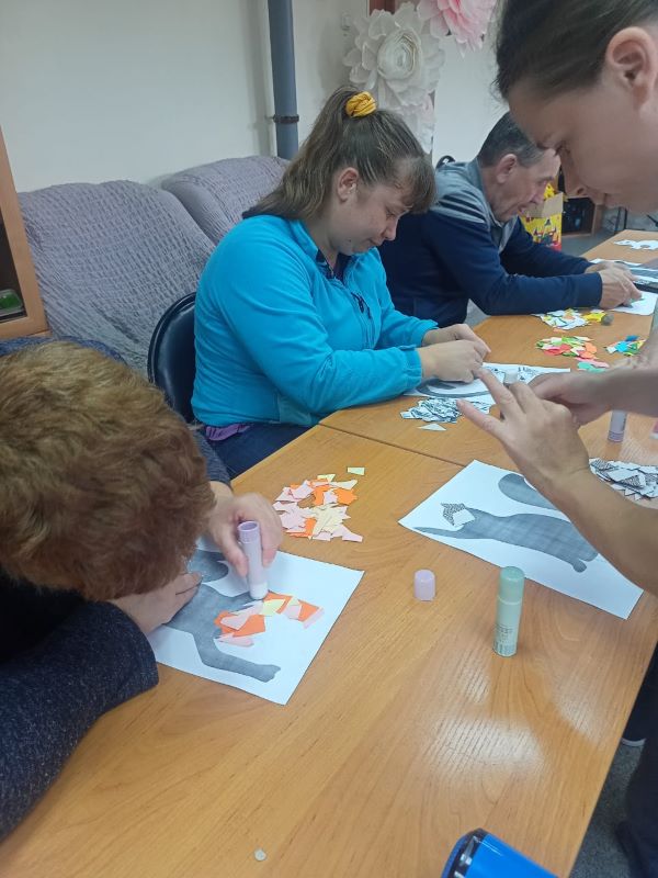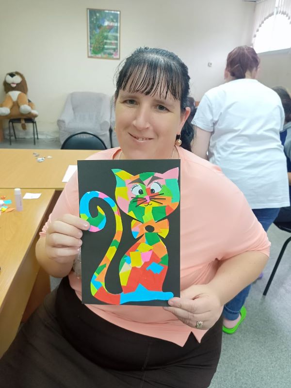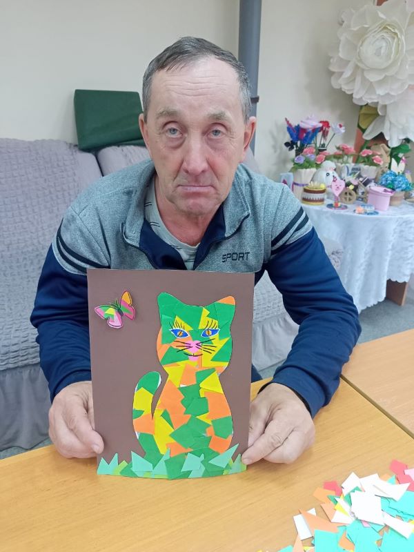 Мастер-класс по бумажной мозайке прошел сегодня в нашем учреждении для получателей социальных услуг. В качестве шаблонов выбрали рисунки кошек. Каждый участник выбрал для себя понравившийся рисунок кота или кошки, и работа закипела! Ребята наклеивали на рисунок кусочки разноцветной бумаги в свободной форме, а затем, наложив на получившуюся мозаику вторую копию первоначального рисунка животного, вырезали по контуру. Далее приклеили глаза, носики, нарисовали усы – и работы «ожили». У каждого получился свой забавный персонаж с выразительным окрасом, а некоторые из ребят дополнили свою работу индивидуальной деталью, придав своему «питомцу» характер и сюжет.