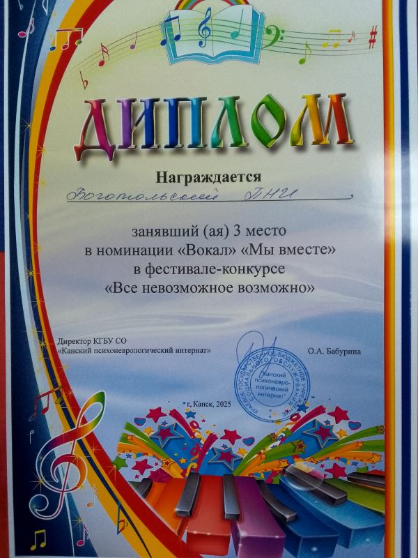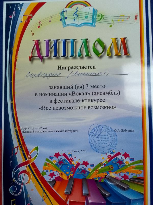 3 место – в номинации «Вокал» «Мы вместе»,